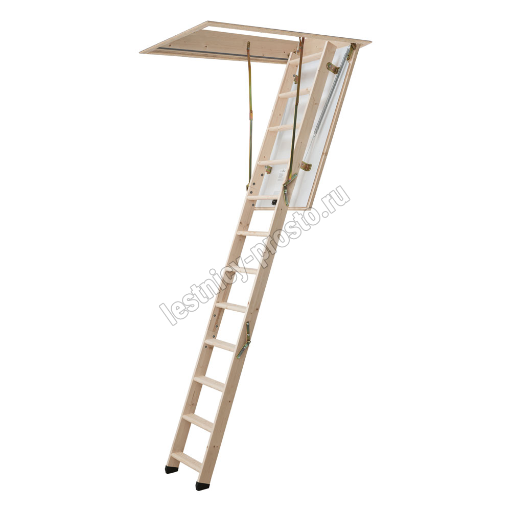 PROF 36 - трехсекционная утепленная лестница из скандинавской медленнорастущей ели, отличающейся повышенной прочностью, ступени из сосны, имеют антискользящие насечки. Лестница оснащена поворотным замком, надежно фиксирующим люк в закрытом состоянии. Высоту базовой модели можно увеличить при помощи дополнительной секции до 3500 мм. Размер короба: 1175х676 мм