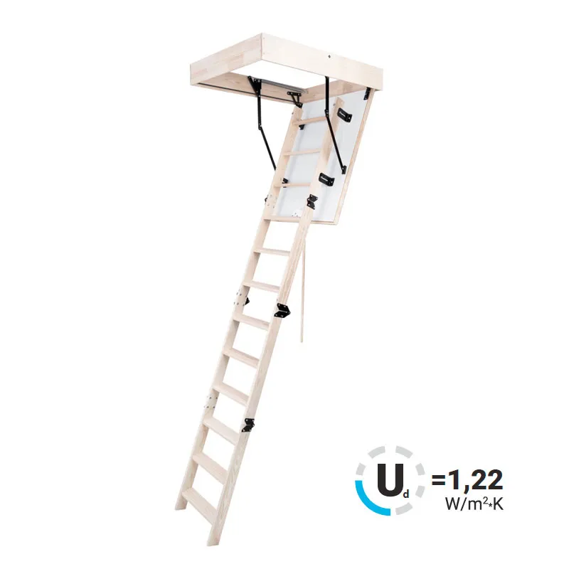 Лестница складная четырехсекционная, изготовлена из массива сосны. Термоизоляционная крышка типа "сэндвич" утеплена пенопластом толщиной 20 мм, облицована с двух сторон ДСП белого цвета.