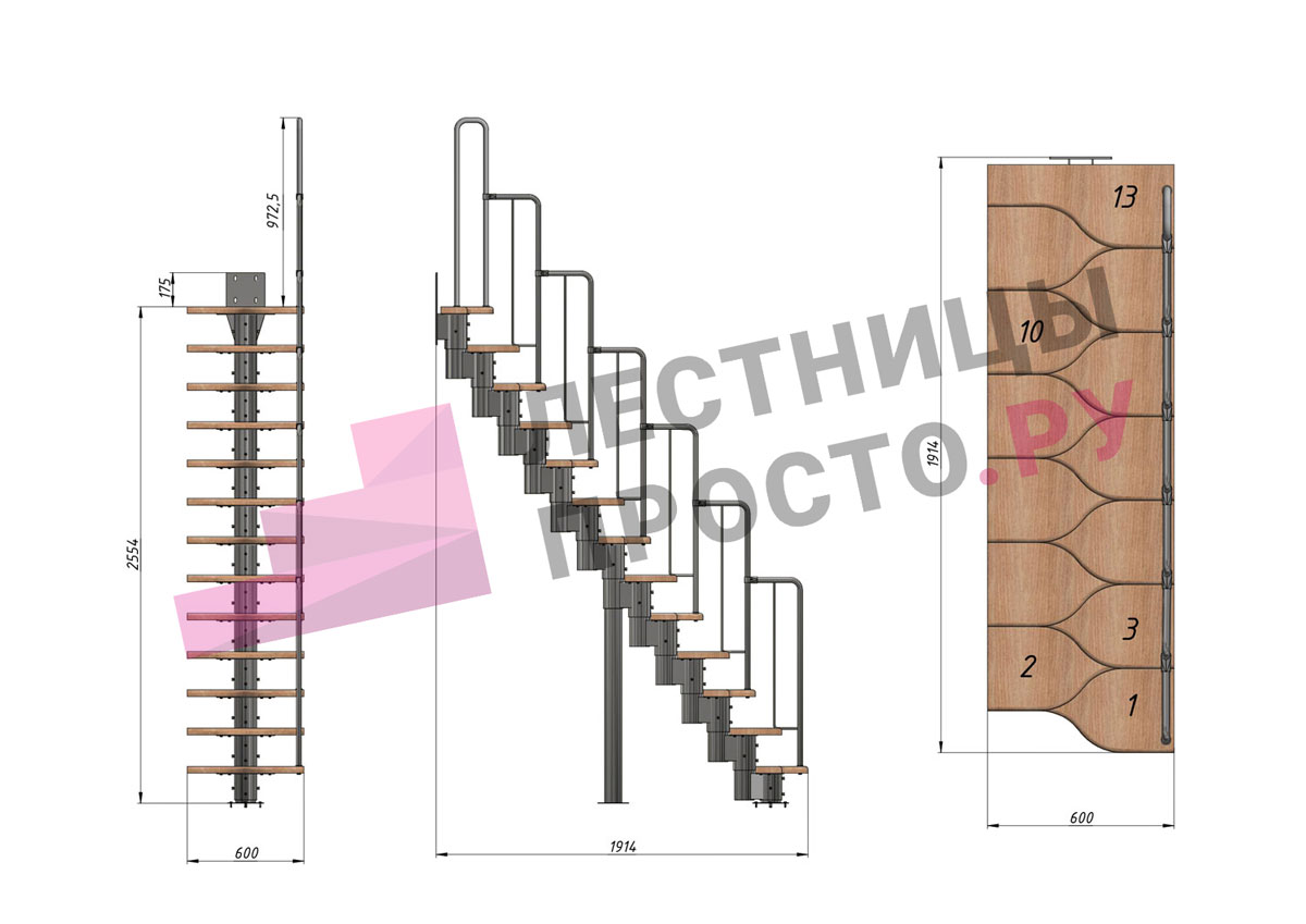 Лестница Prosto Urban Black гусиный шаг 600 мм, h234-336 см (13 ступеней), бук