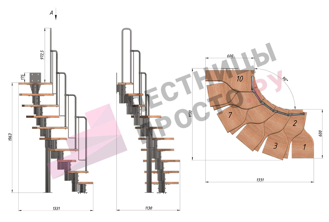 Лестница Prosto Urban Grey г-образная гусиный шаг 600 мм, h180-264 см (10 ступеней)