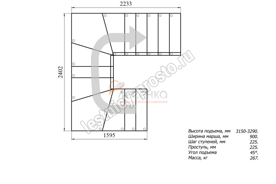 Модульная лестница Спринт 225 3150-3290, Белый, Лиственница, Нержавеющая сталь