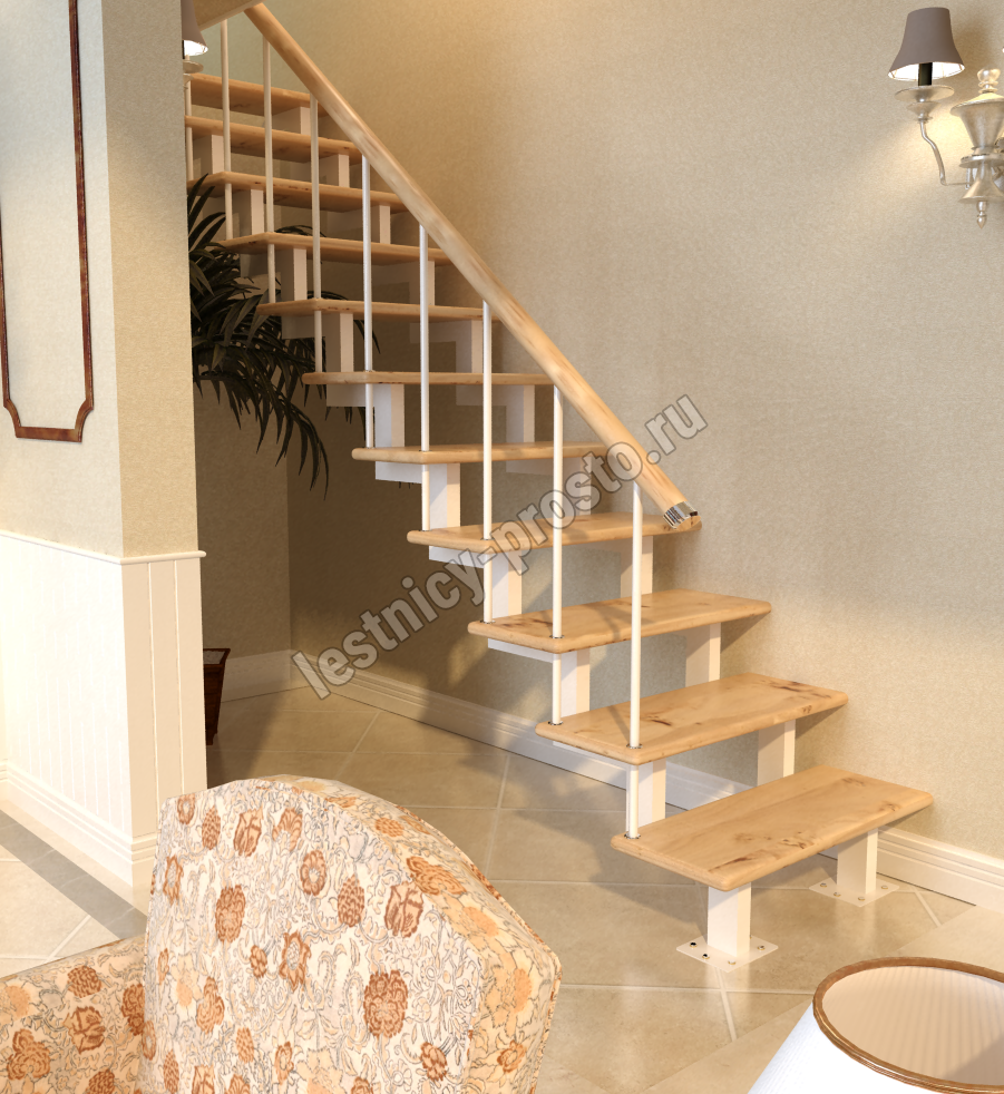 Ступени лестницы выполнены из сращенного щита категории АВ без какого-либо покрытия. Вы можете заказать у нас предварительную профессиональную покраску деревянных элементов лестницы и ограждения в любой цвет.