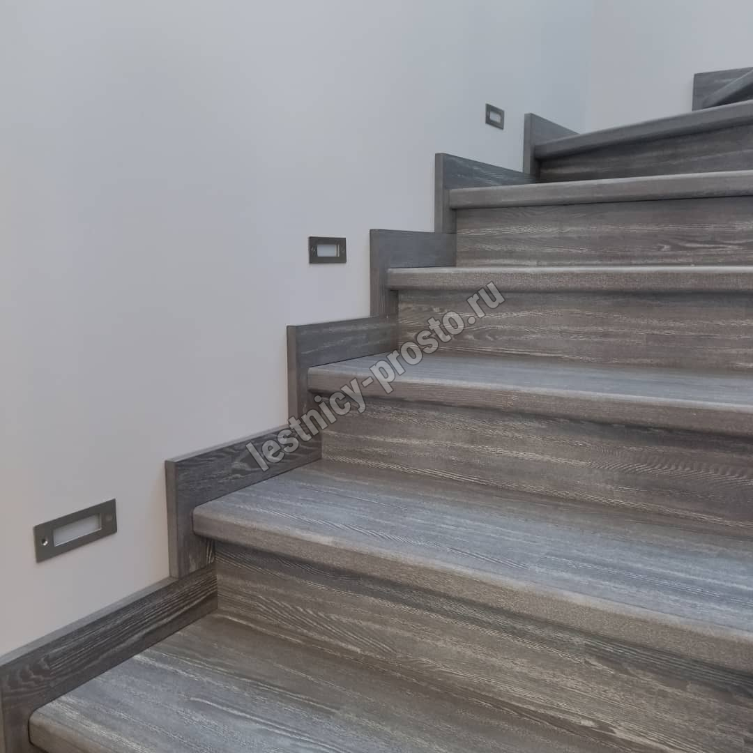 Подступенники, фальш-косоуры и сапожки (пристенной плинтус) выполнены из дуба.