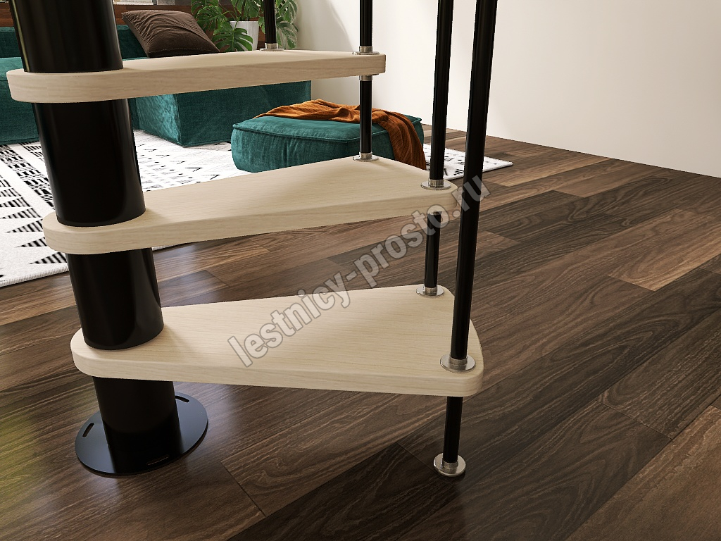 Экономит пространство. Высота ступеней регулируется с шагом 3 мм. в пределах 212-242 мм., благодаря чему, лестница прекрасно подгоняется под необходимую высоту.