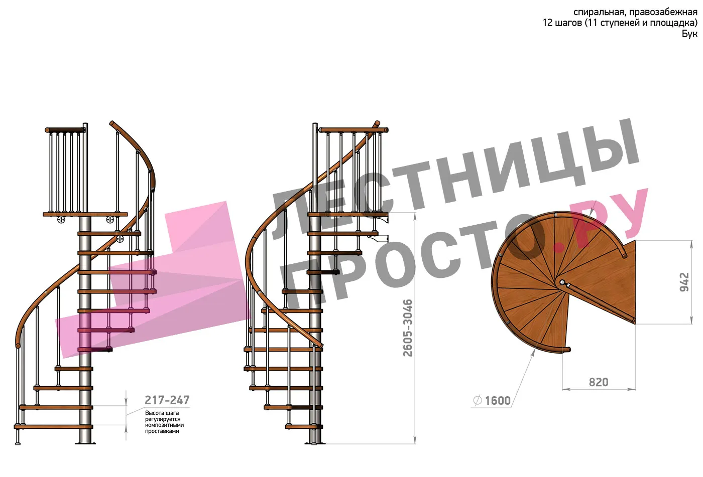 | Винтовая лестница Prosto Spiral White D160см, h260.5-304.6 см, бук |